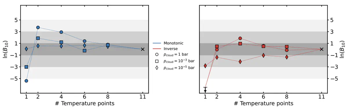Impact of the number of T-p nodes in atmospheric retrievals – Image credit: S. SchleichContext. When retrieving exoplanet atmospheric characteristics from spectroscopic observations, parameter estimation results strongly depend on the chosen forward model. In the era of the James Webb Space Telescope (JWST) and other next-generation facilities, the increased signal-to-noise ratio (S/N), wavelength coverage, and spectral resolution of observations warrant closer investigations into factors that could inadvertently bias the results of these retrievals. Aims. We aim to investigate the impact of utilising multi-point pressure–temperature (p–T) profiles of varying complexity on the retrieval of synthetically generated hot-Jupiter transmission spectra modelled after state-of-the-art observations of the hot Jupiter WASP-39 b with JWST. Methods. We performed homogenised atmospheric retrievals with the TauREx retrieval framework on a sample of synthetically generated transmission spectra, accounting for varying cases of underlying p–T profiles, cloud-top pressures, and expected noise levels. These retrievals are performed using a fixed-pressure multi-point p–T prescription with increasing complexity, ranging from isothermal to an eleven-point profile. We evaluated the performance of the retrievals based on the Bayesian model evidence, and the accuracy of the retrievals was compared to the known input parameters. Results. We find that performing atmospheric retrievals using an isothermal prescription for the pressure–temperature profile consistently results in wrongly retrieved atmospheric parameters when compared to the known input parameters. For an underlying p–T profile with a fully positive lapse rate, we find that a two-point profile is sufficient to retrieve the known atmospheric parameters, while under the presence of an atmospheric temperature inversion, we find that a more complex profile is necessary. Conclusions. Our investigation shows that, for a data quality scenario mirroring state-of-the-art observations of a hot Jupiter with JWST, an isothermal p–T prescription is insufficient to correctly retrieve the known atmospheric parameters. We find a model complexity preference dependent on the underlying pressure–temperature structure, but we argue that a p–T prescription on the complexity level of a four-point profile should be preferred. This represents the overlap between the lowest number of free parameters and the highest model preference in the cases investigated in this work.